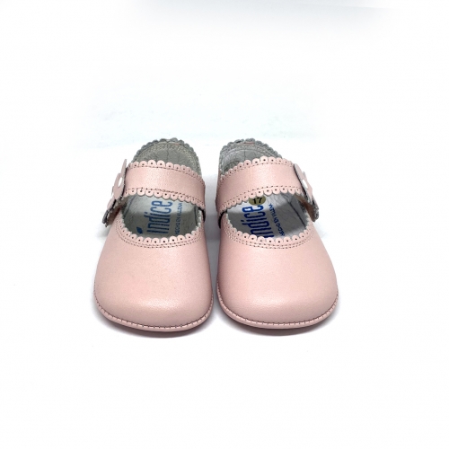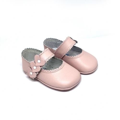 Peuque corazones en color rosa con cierre de velcro todo de piel. Fabricado en Alicante.