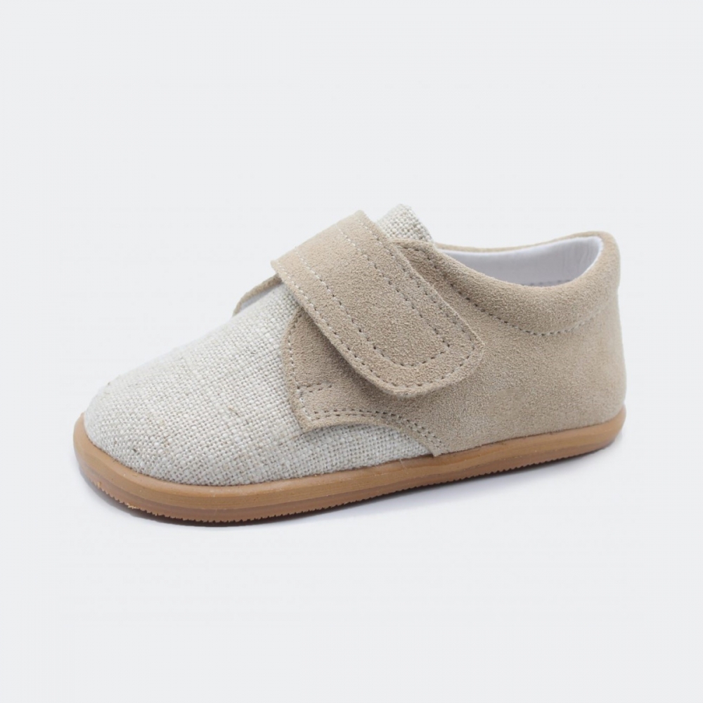 Zapato blucher de vestir respetuoso de la marca Blanditos by crio`s modelo Faro combinado en lino con serraje. Con cierre de velcro antiaderente y suela color caramelo de goma antideslizante. Super blanditas y elegantes. Disponibles en color lino y en color azul marino.