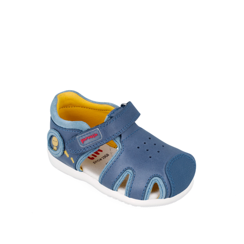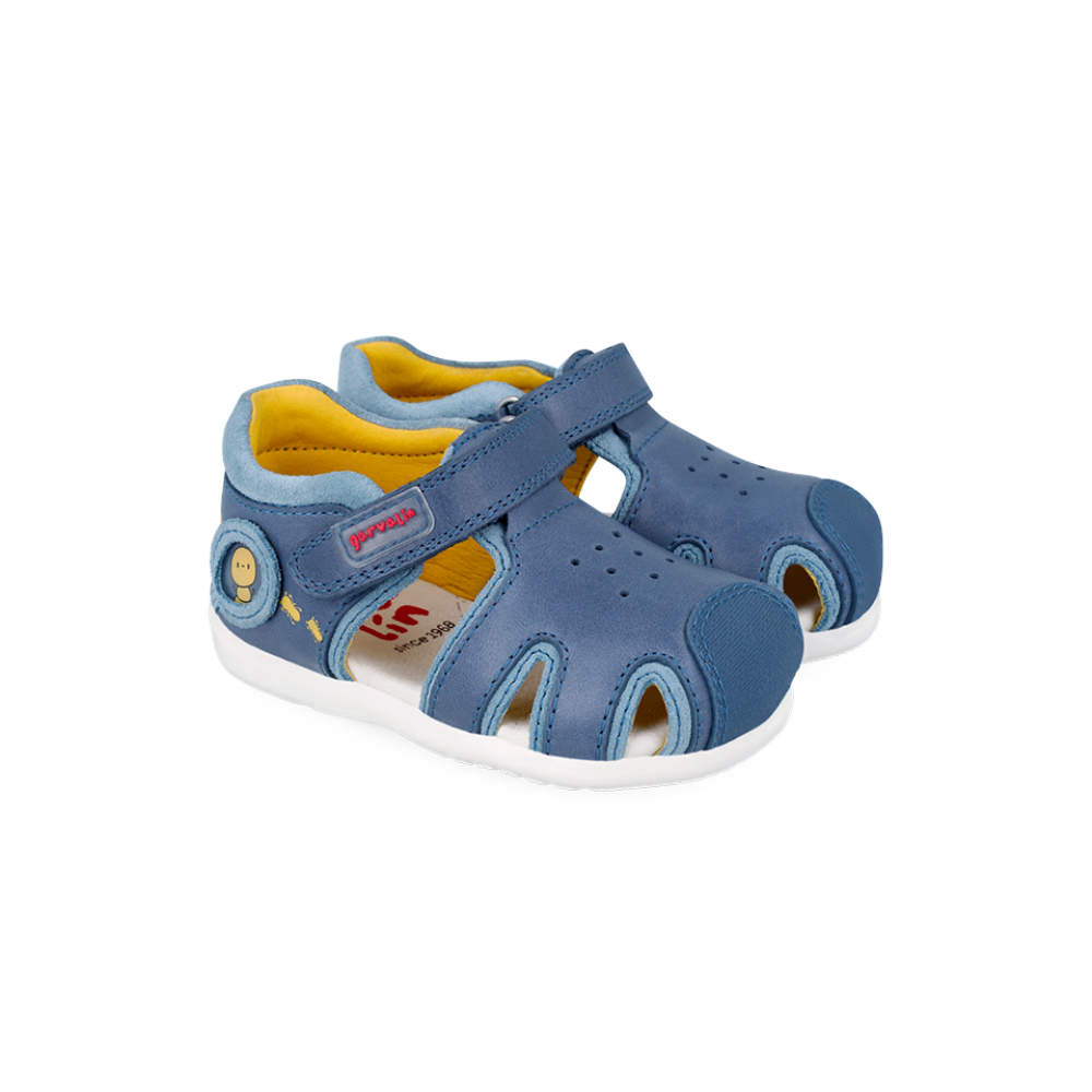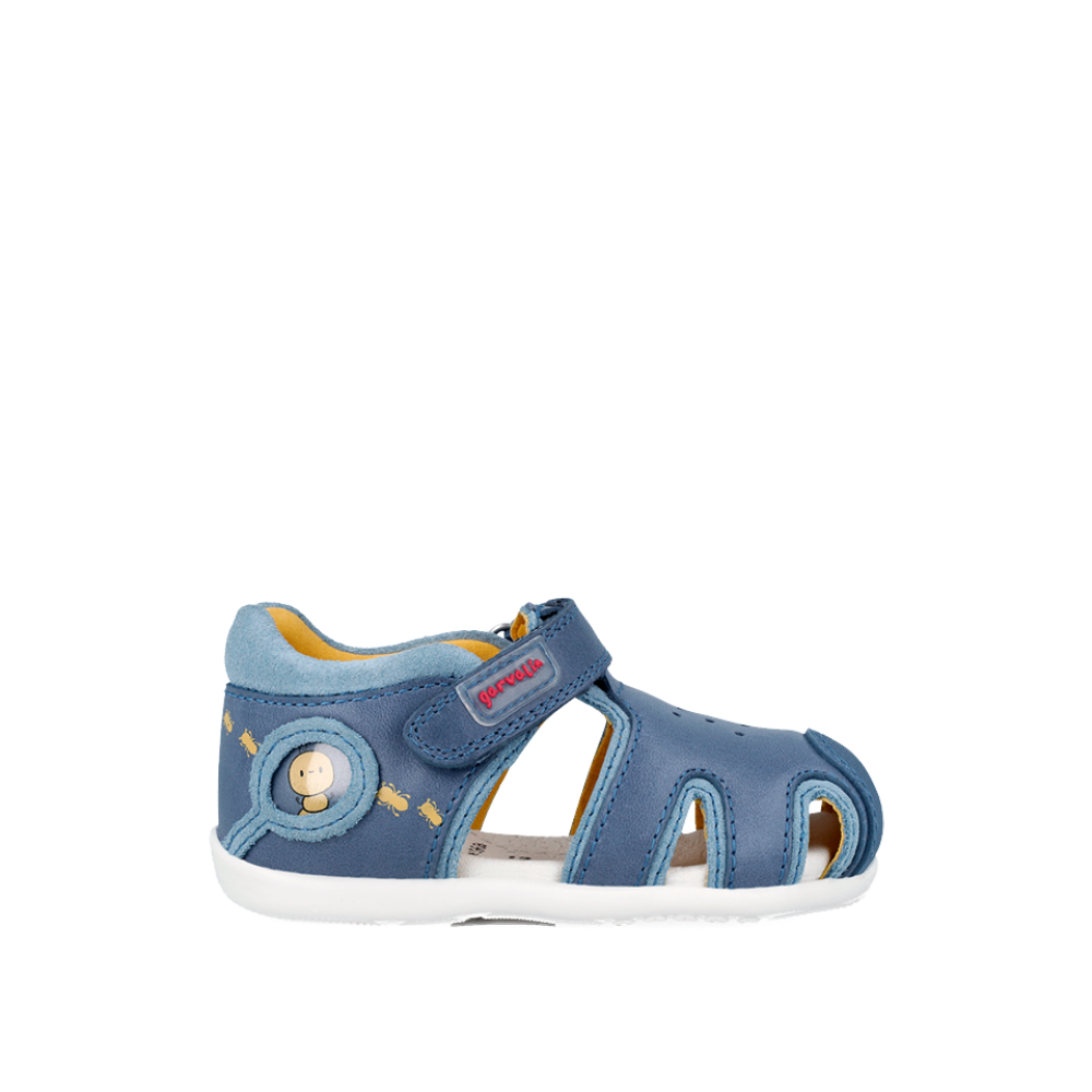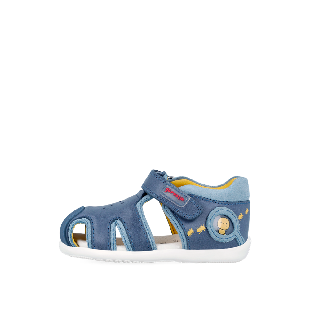 Sandalia de primeros pasos de niña fabricadas en piel azul cerradas por la puntera con adornos de hormiguitas y lupa de marca garvalín. Sandalia blandita y flexible, diseñada para proteger sin sobreproteger en entornos no controlados. Plantilla plana, sin arco plantar, transpirable que previene la aparición de hongos y bacterias.