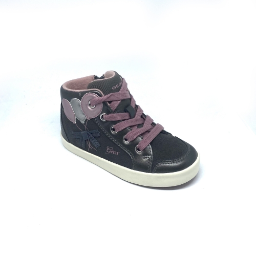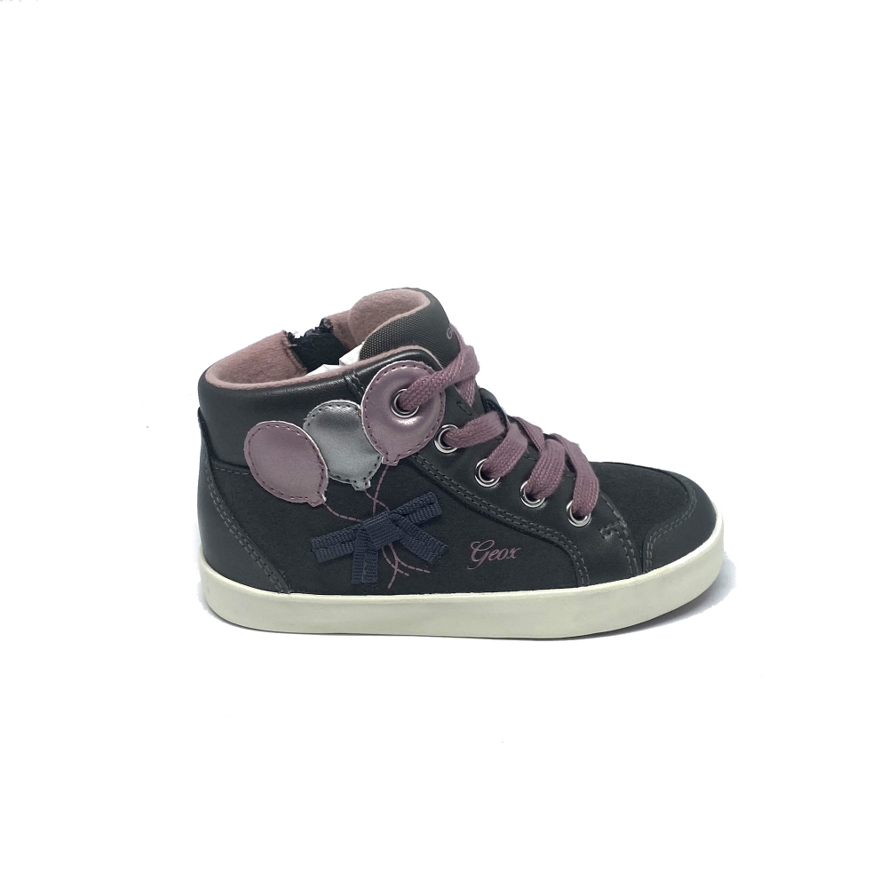Botita de la marca Geox en color gris con un detalle de unos globos en color rosa. Lleva cordón pero también una cremallera lateral para mejor ajuste.
