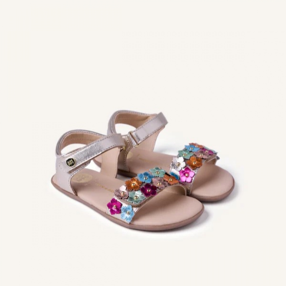 Sandalias de piel con tachas y detalle bicolor de flores. Planta estampada. Diseñadas siguiendo las tendencias minimalistas para garantizar la pisada natural. Cuentan con cierres de velcro ajustables en el tobillo y en el empeine.