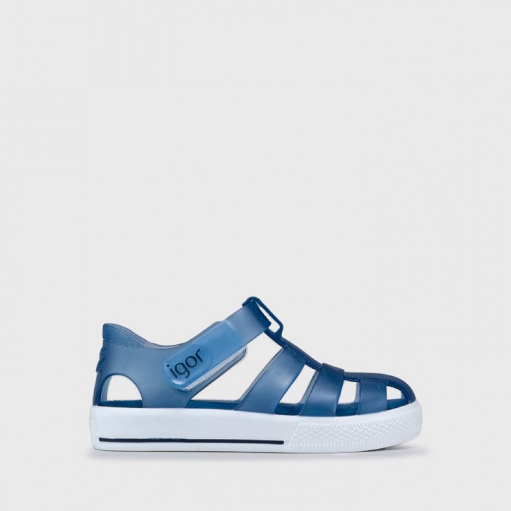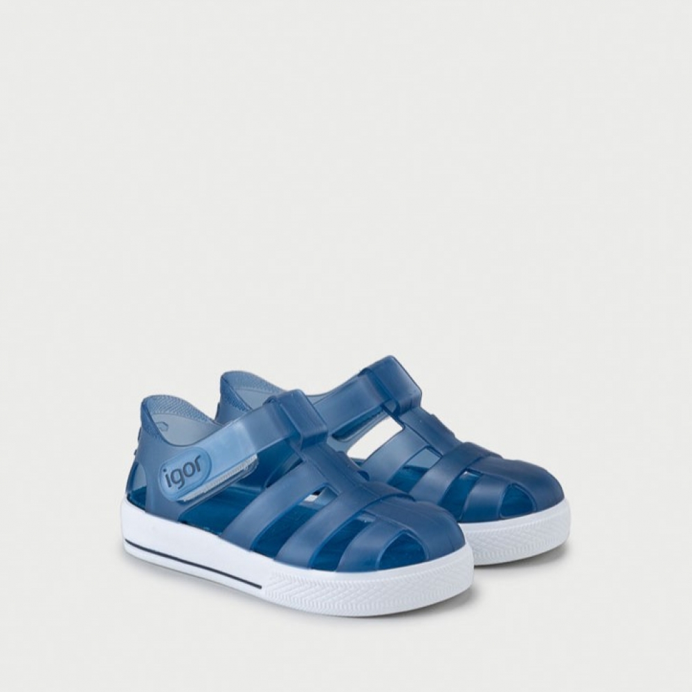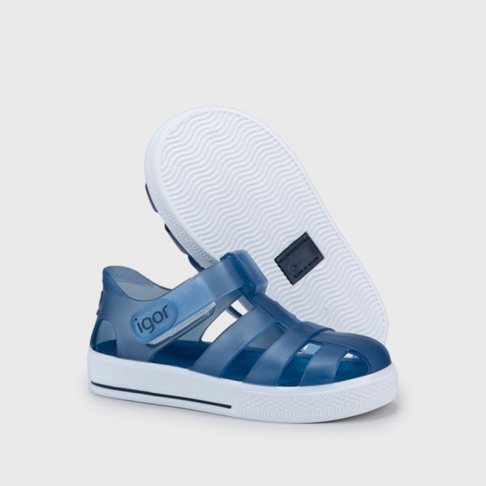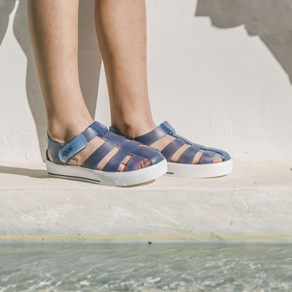 Cangrejera traslúcida de estilo sport, con cierre adherente de velcro y plantilla confort extraíble.