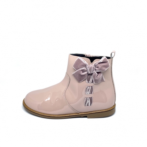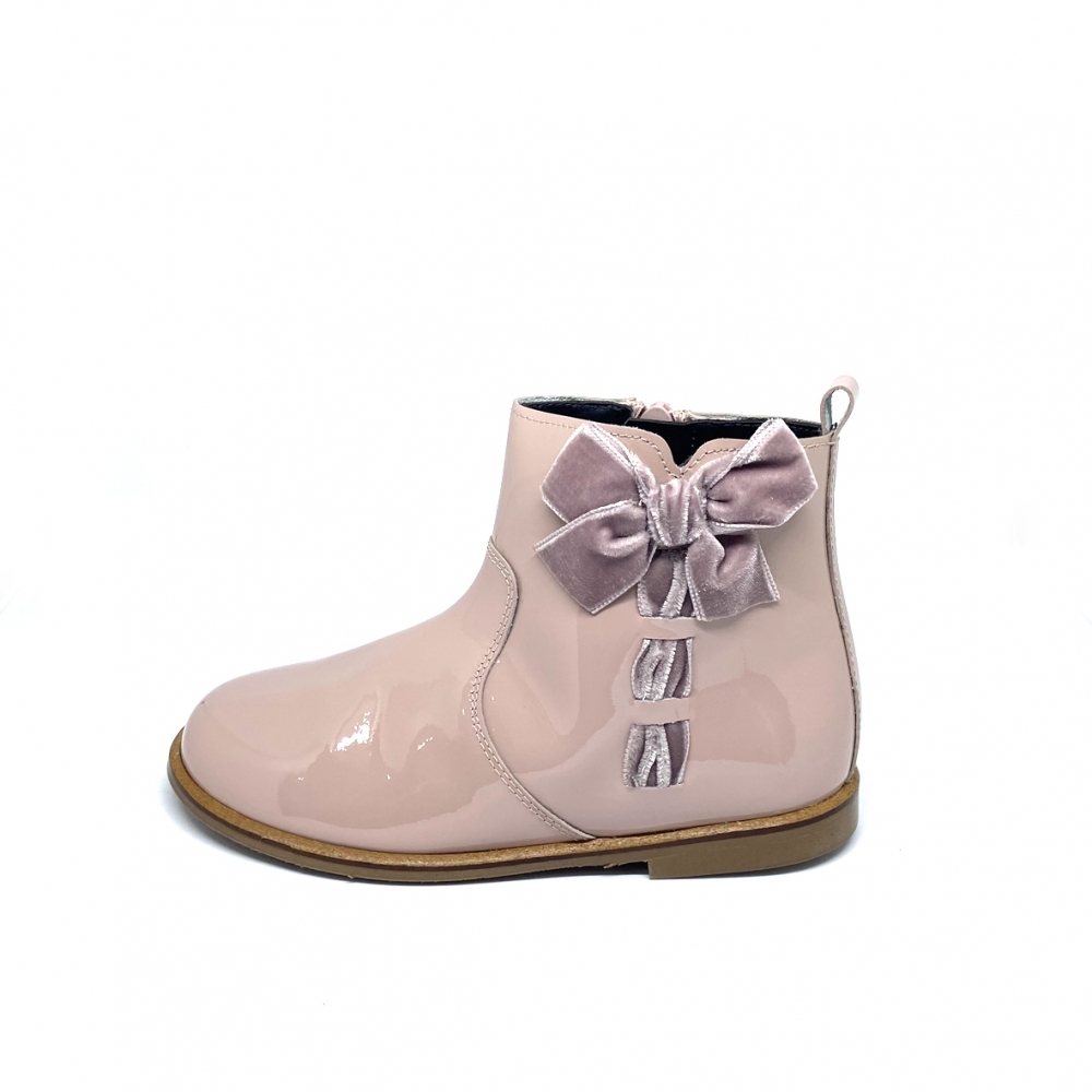 Botin charol rosa de la marca landos con una lazada de terciopelo en lateral. Botita en piel forrada en piel y fabricada en Villena, Alicante.