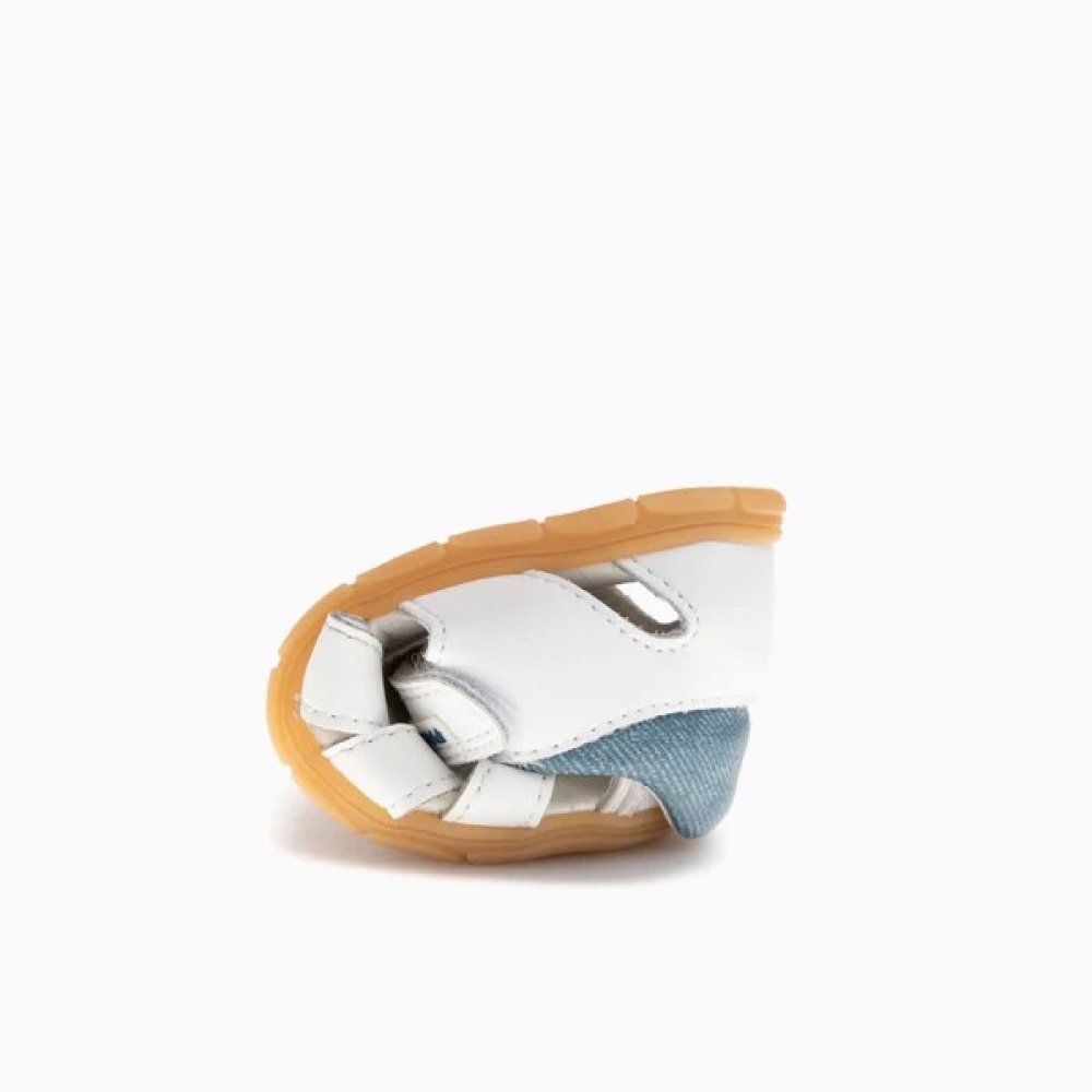 Su diseño combina funcionalidad y estilo, con una puntera reforzada que protege los dedos de golpes y una trasera en color jeans que aporta un toque moderno. Disponibles en blanco y azul marino, estas sandalias se convierten en un básico imprescindible para los más pequeños.