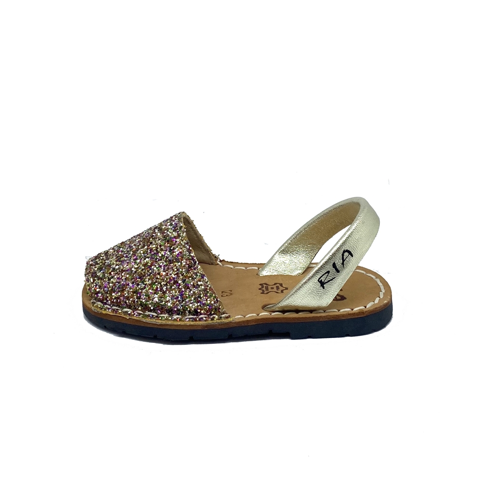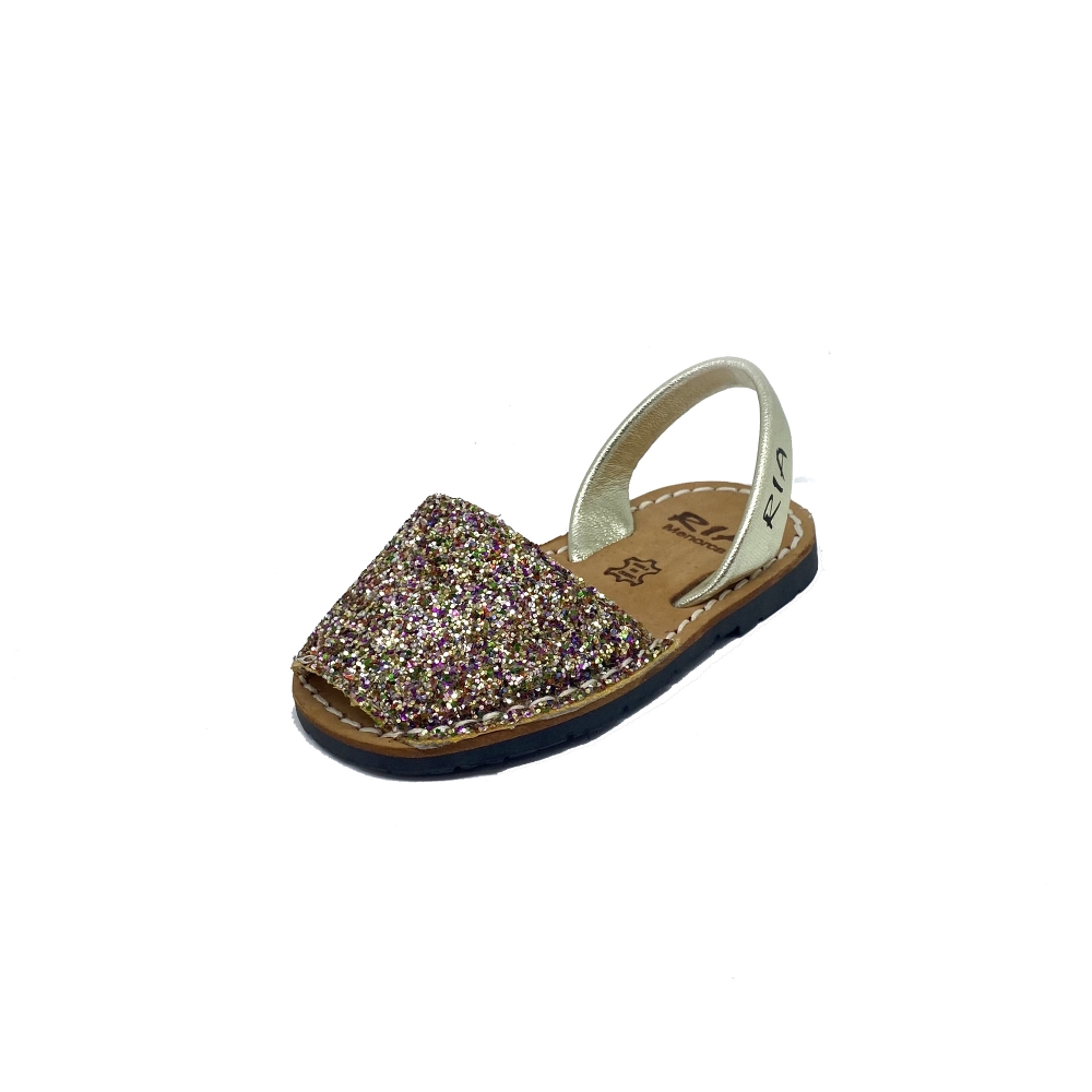 Menorquina de la marca RIA clásica con correa trasera en purpurina glitter multicolor y trasera color champán. Suela de neumático negra. La marca RÍA, las de toda la vida, tu marca de confianza.
