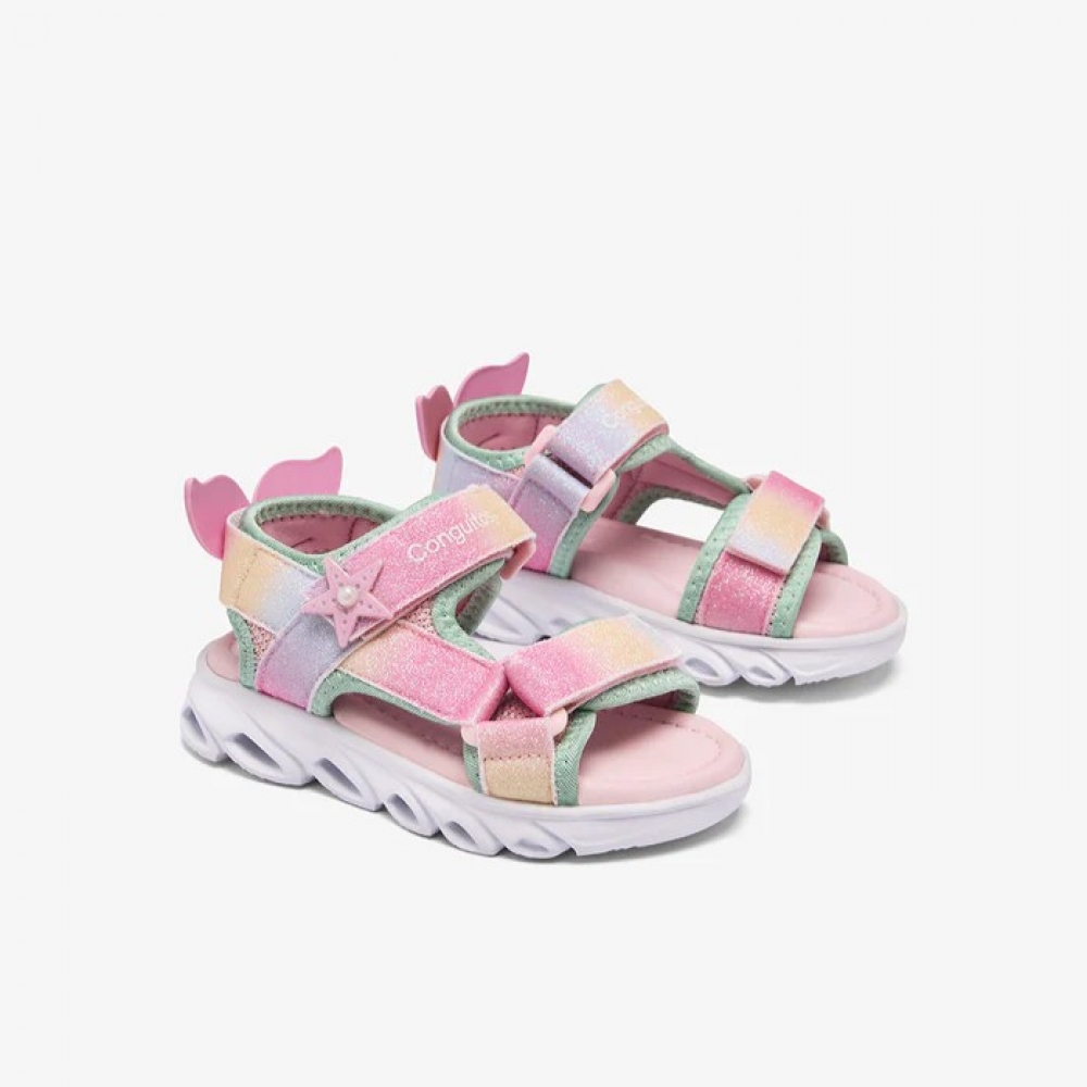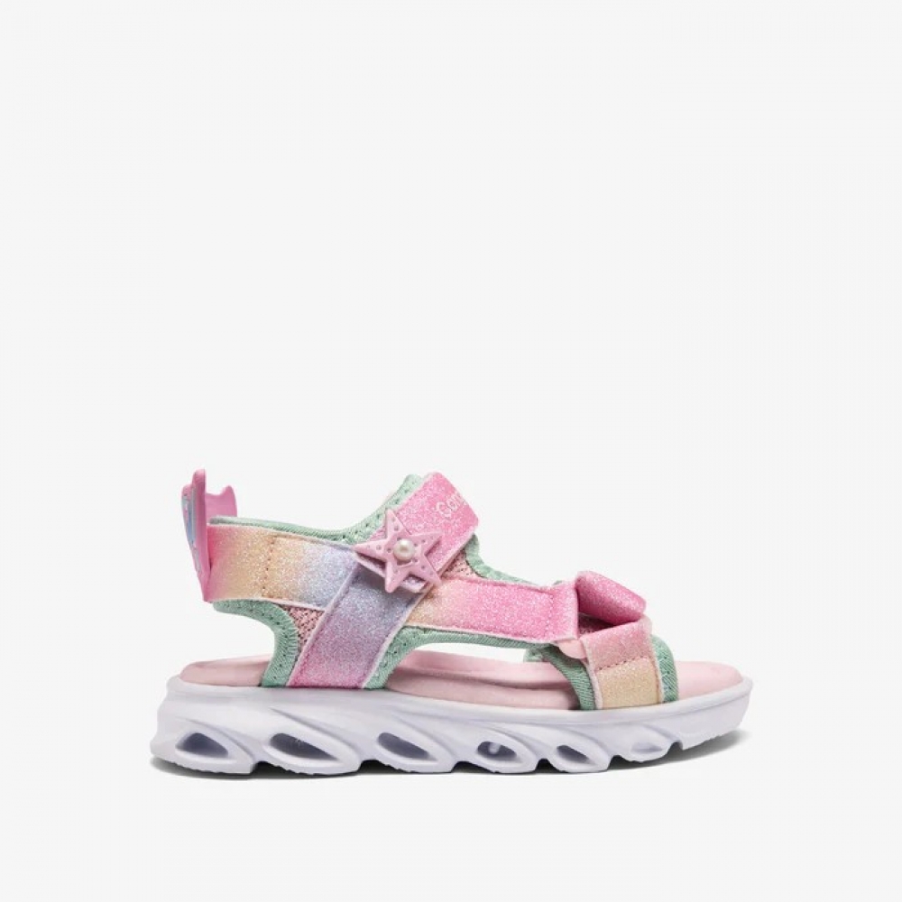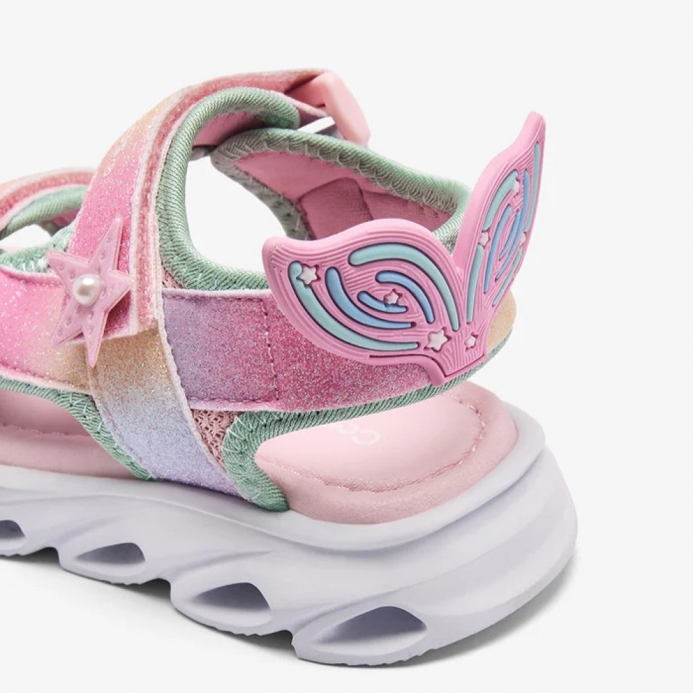 Sandalias de niña con luz en tonos multicolor con glitter. Detalles inspirados en el mar como la estrella en el lateral y detalle de talón de cola de sirena. Suela de EVA con luz y un cierre fácil de tira adherente, ideales para el verano.