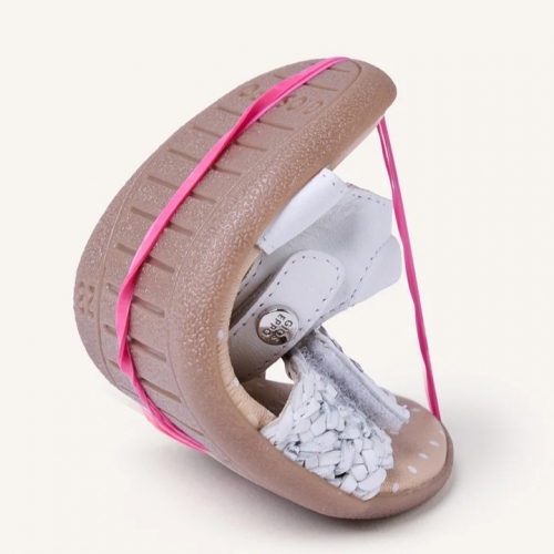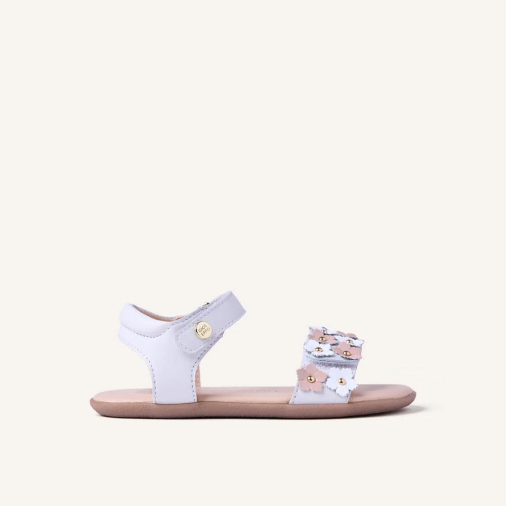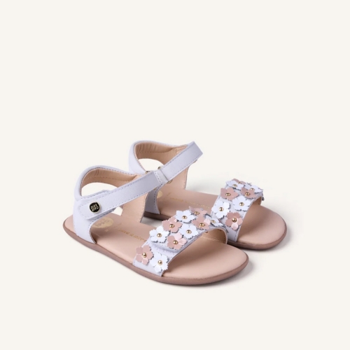 Sandalias de piel con tachas y detalle bicolor de flores. Planta estampada. Diseñadas siguiendo las tendencias minimalistas para garantizar la pisada natural. Cuentan con cierres ajustables de velcro en el tobillo y en el empeine.