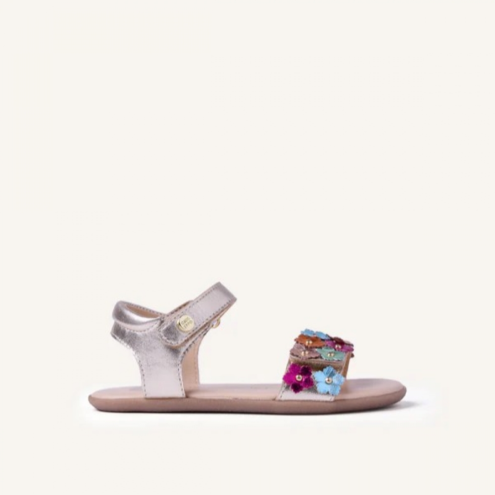 Sandalias de piel con tachas y detalle bicolor de flores. Planta estampada. Diseñadas siguiendo las tendencias minimalistas para garantizar la pisada natural. Cuentan con cierres de velcro ajustables en el tobillo y en el empeine.