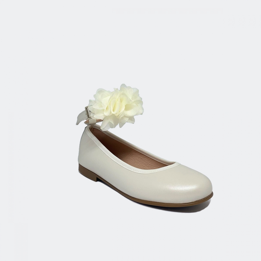 Zapato de comunión mercedes en color cava con adono de flores de quita y pon en la pulsera. Elegancia y versatilidad para un día inolvidable.