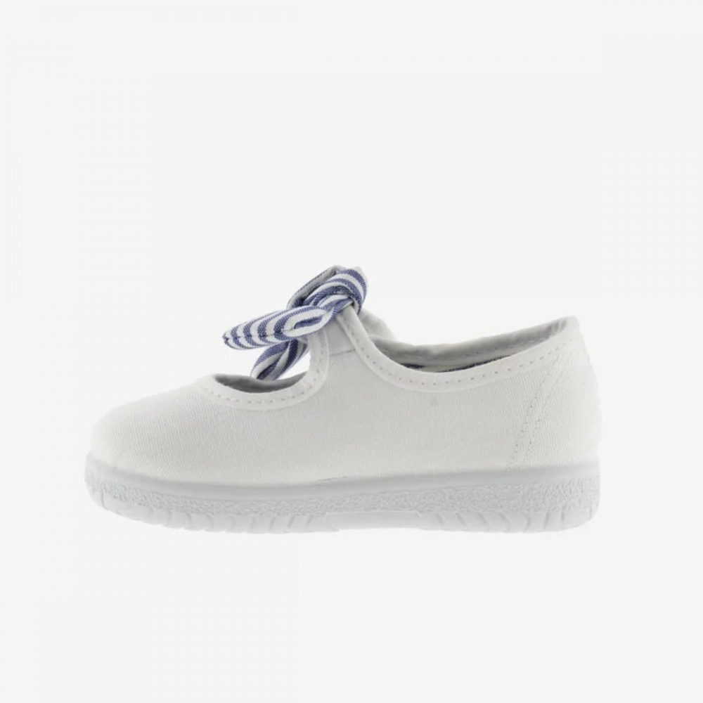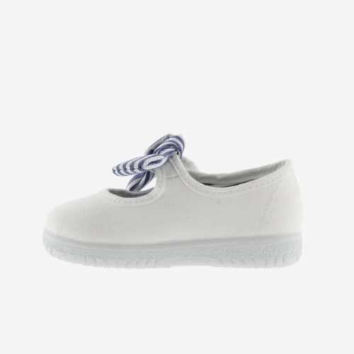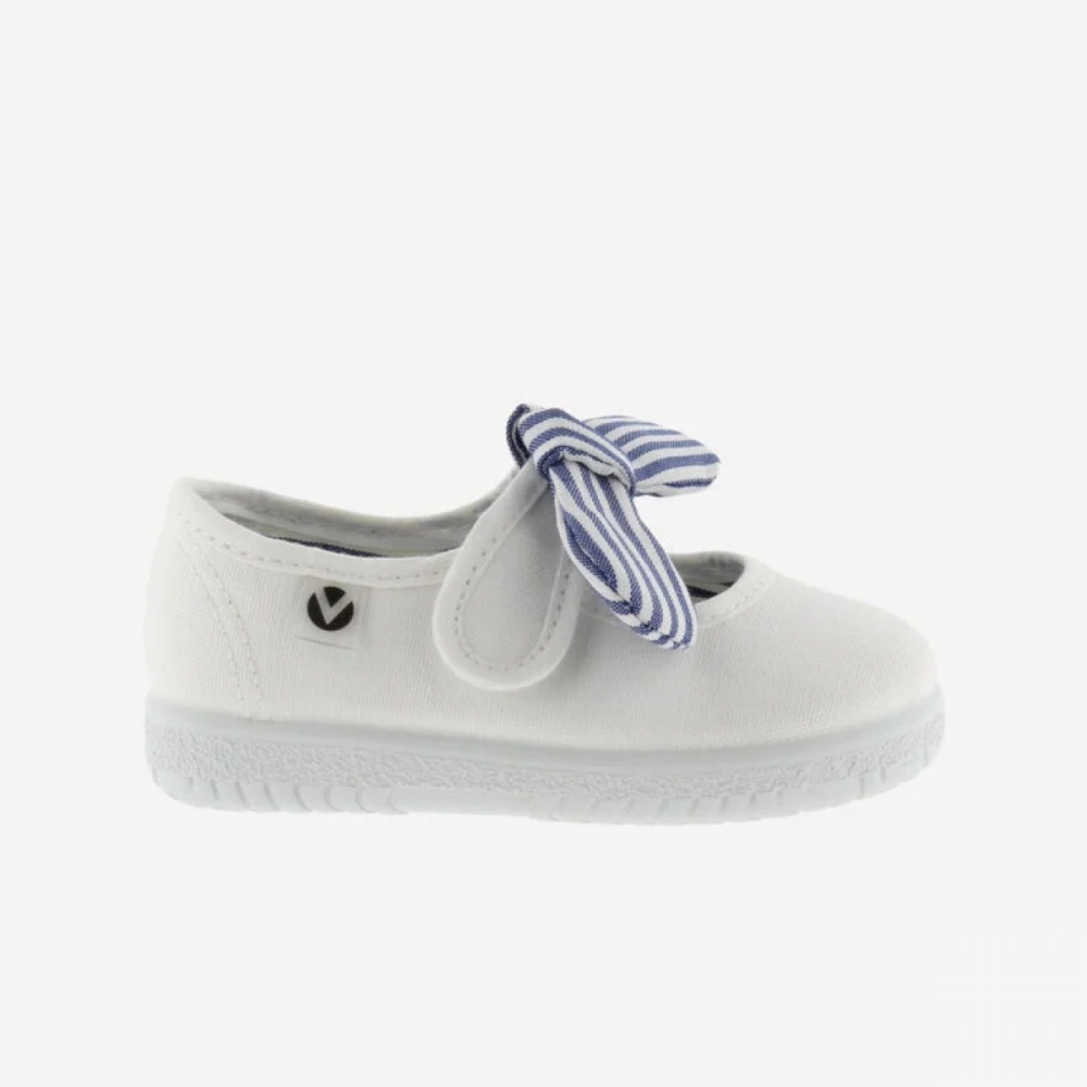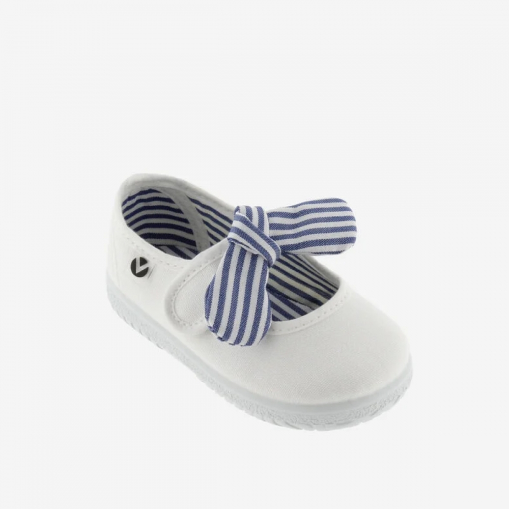 Merceditas de lona fabricadas en España con algodón ecológico. El pañuelo incluye detalles de rayitas y es extraíble, para facilitar el lavado. Todo un clásico de victoria para las peques de la casa.Su horma es más ancha por lo que facilita el calce de los pies más anchos de los más pequeños. La suela vulcanizada es muy flexible y resistente. Cierre medieante tira adherente, que facilita el calce y fomenta su autonomía.