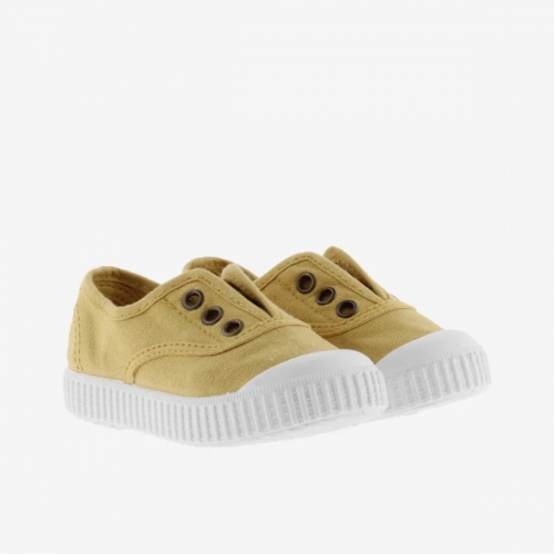 Victoria de lona con elástico y sin cordones para niños. Están fabricadas en una combinación única de algodón reciclado DREC® (Dyeable Recycled Eco Cotton) y algodón ecológico cultivado, hilado y tejido en España. Cuentan con una suela de caucho natural vulcanizado que garantiza durabilidad y flexibilidad con refuerzo de goma en la puntera que añade resistencia. Elástico central en el empeine facilitando que los niños se calcen y descalcen fomentando así su autonomía. Incluye una plantilla interior extraíble para mayor confort y son muy fáciles de lavar. Tallan pequeñas, se recomienda pedir una talla más de la habitual.