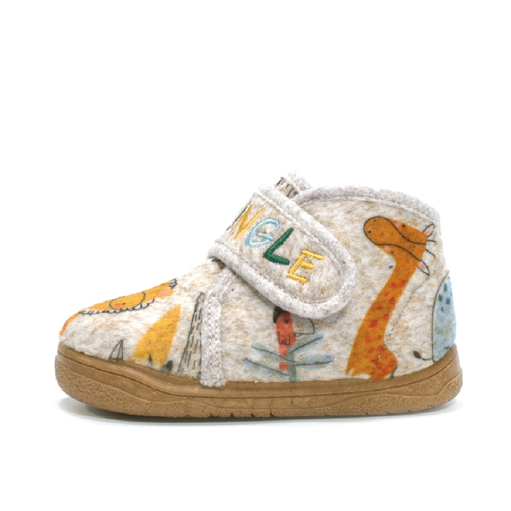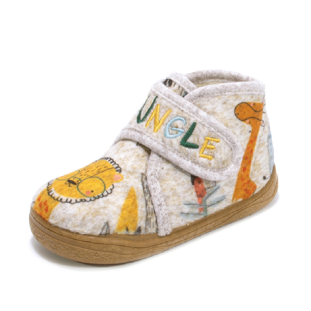 La zapatilla de andar por casa respetuosa de Zapyflex con motivos de jungla está pensada para que los peques disfruten de la comodidad en casa sin renunciar a un calzado saludable. Su diseño divertido con animales de la selva encanta a los niños, mientras que su construcción ergonómica cuida cada paso.